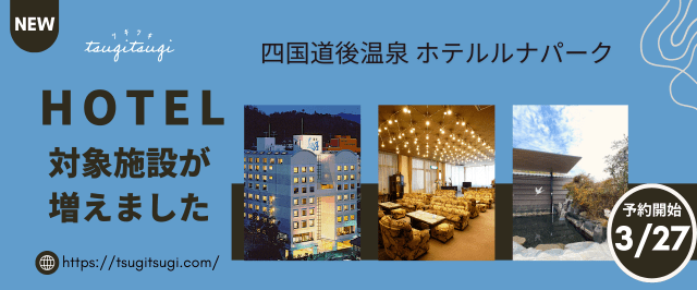 本日3/27よりTsugiTsugiの対象施設に日本最古の温泉地として有名な四国・道後温泉にある1ホテルが加わりました。以下にて簡単にご紹介します♪